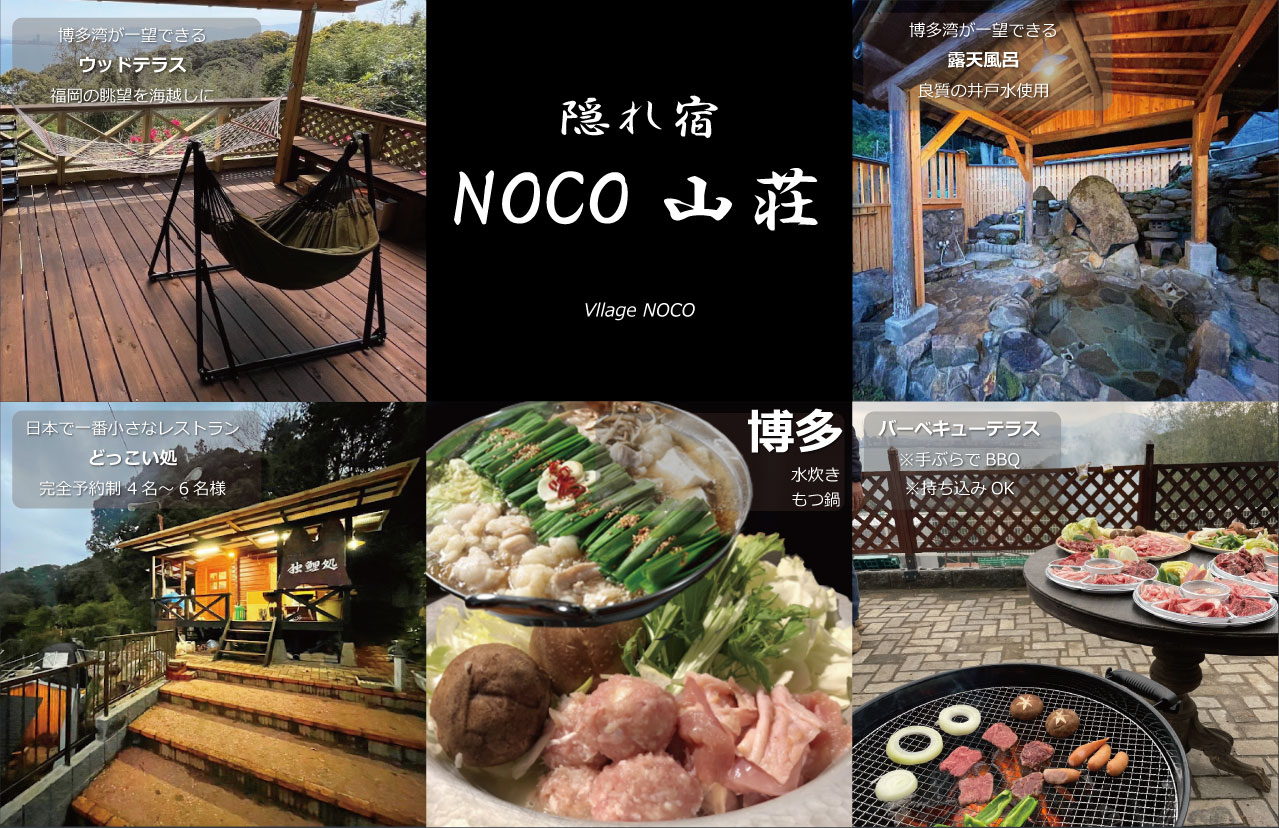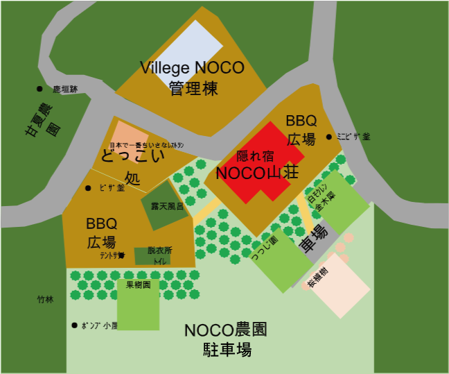 Village NOCOは、総坪数1500坪(約5000㎡)の敷地に「隠れ宿 民泊NOCO山荘」「BBQ広場」「日本で一番小さなレストランどっこい処」「管理棟」「果樹園」「野菜畑」「露天風呂」「テントサウナ」が有りピザ釜でピザ作り等が楽しめる施設になっております。
